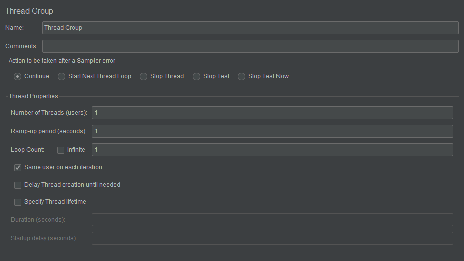 - Ramp-up period (seconds) : 동시에 모든 사용자가 접속하는 시간 (한번의 실행을 몇초동안 완료시킬 것인지 나타내는 값)